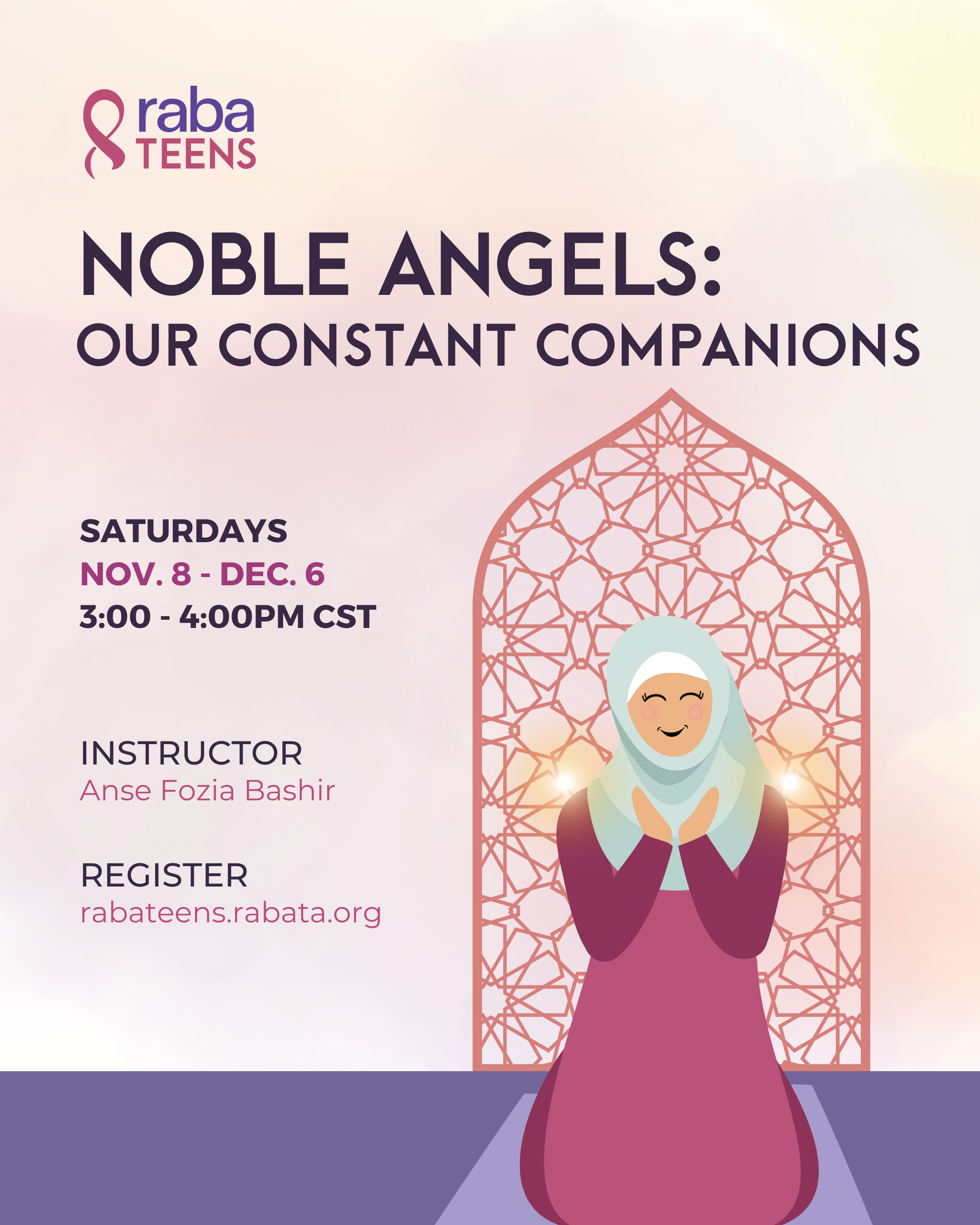 Together, we will focus on these noble, sinless beings who obey Allah without fail and are a core part of our aqidah. Each week will highlight the different roles and responsibilities of angels and introduces simple, practical actions that invite their presence and prayers, such as mindful speech, obedience to parents, or joining a dhikr gathering.
