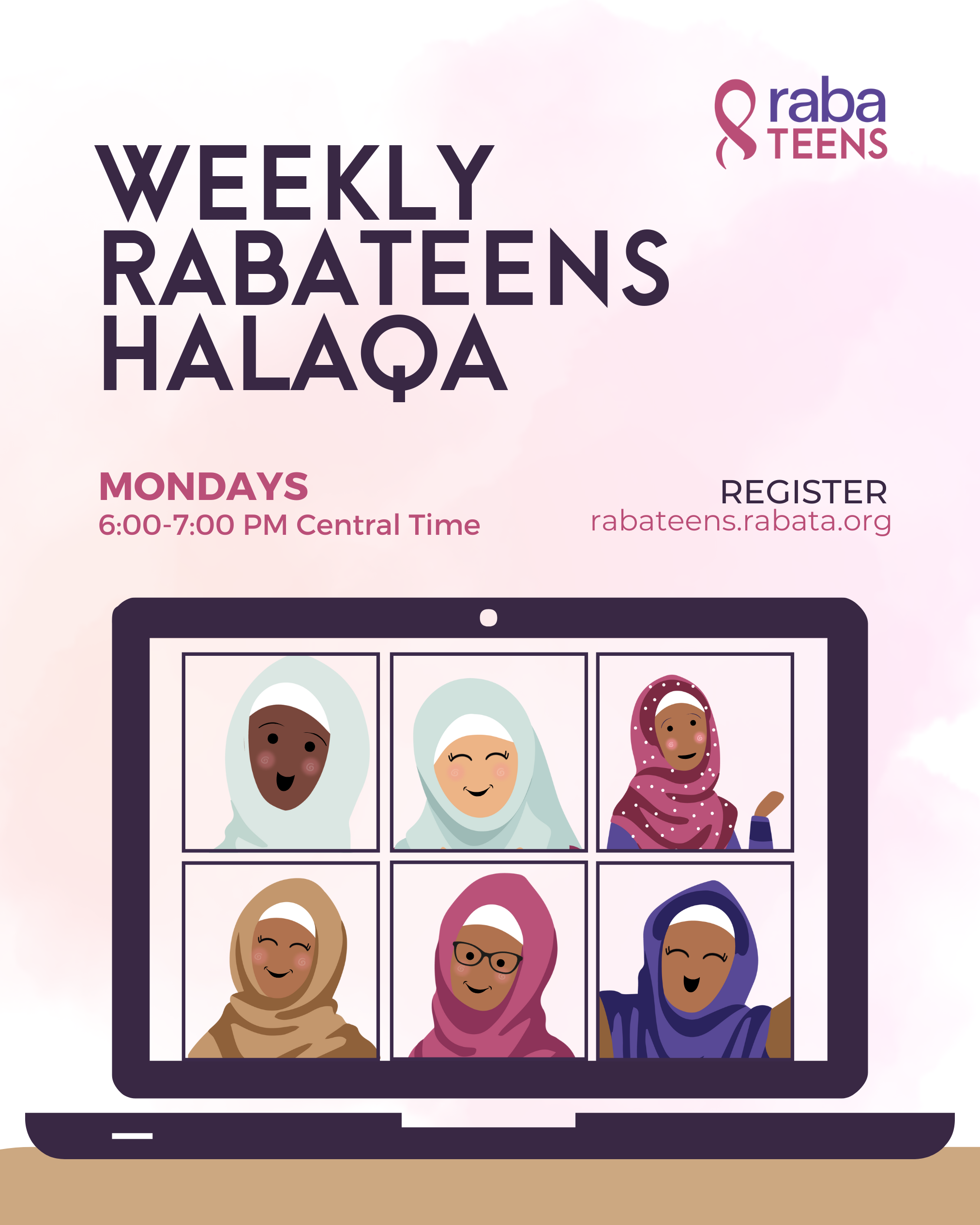 The RabaTEENS Weekly Teen Halaqa is a space for teens to grow spiritually together. Teens will meet weekly on Zoom to discuss lessons from the Quran and Hadith, seasonal topics, reminders of how to hold strong to faith as they step into womanhood, and real talk about the issues they are facing in their day-to-day lives. Held on Monday evenings (Central Time), it will include a reading of Surat Yasin to gain the blessings that it brings. At the end of each session, there will be an open Q&A session.